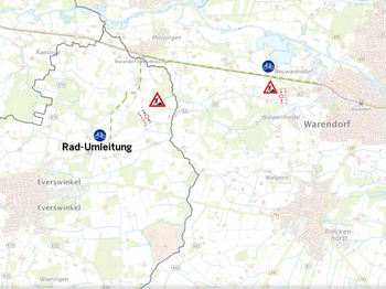 Solange die Bauarbeiten am Radweg andauern, wird die zugelassene Höchstgeschwindigkeit auf der Straße im Baustellenbereich aus Sicherheitsgründen auf 50 km/h beschränkt.