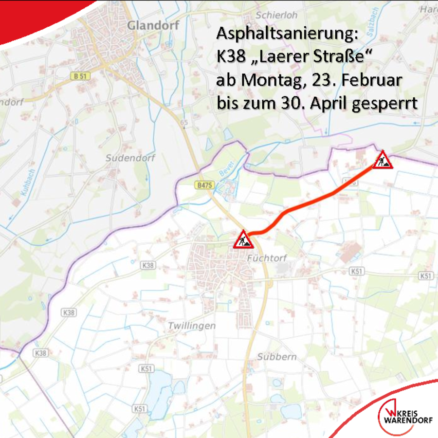 Der Kreis Warendorf saniert die Laerer Straße (K 38) zwischen Füchtorf und Bad Laer auf einer Länge von 2,6 km. Dazu muss die Straße von Montag, 23. Februar an voll gesperrt werden. Anlieger können ihre Grundstücke erreichen. Dabei sind gewisse Einschränkungen zwischenzeitlich unvermeidbar.