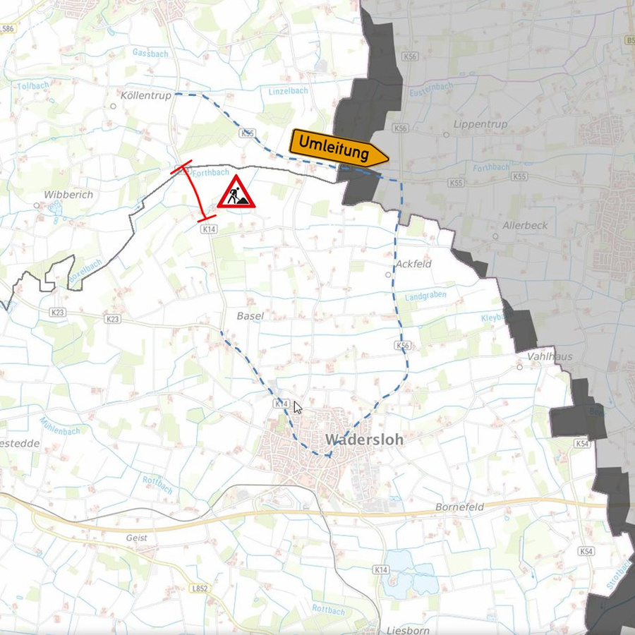 Eine Umleitung ist über Wadersloh und weiterhin die Langenberger Straße (K 56) sowie die Straße „Cöllentrup“ (K 55) eingerichtet und ausgeschildert.