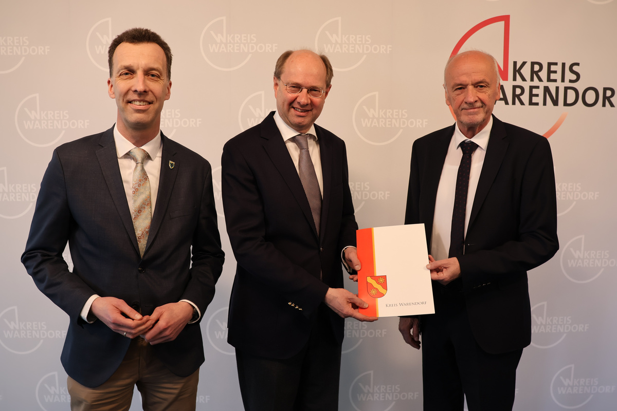Die Gemeinde Beelen kann ihren Haushaltsplan bewirtschaften und die geplanten Maßnahmen umsetzen. Die Freigabe hierfür erhielt Bürgermeister Rolf Mestekemper jetzt von Landrat Dr. Olaf Gericke im Kreishaus. Auch der langjährige Gemeindekämmerer Erich Lillteicher, der extra seinen Ruhestand für die Erstellung des Haushaltsplanes 2026 unterbrochen hatte, war bei dem Termin anwesend.