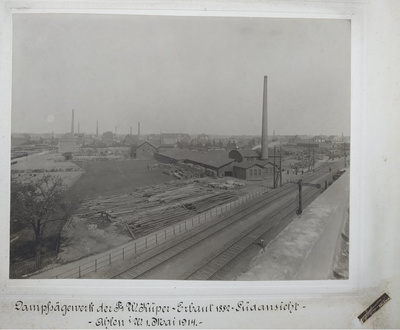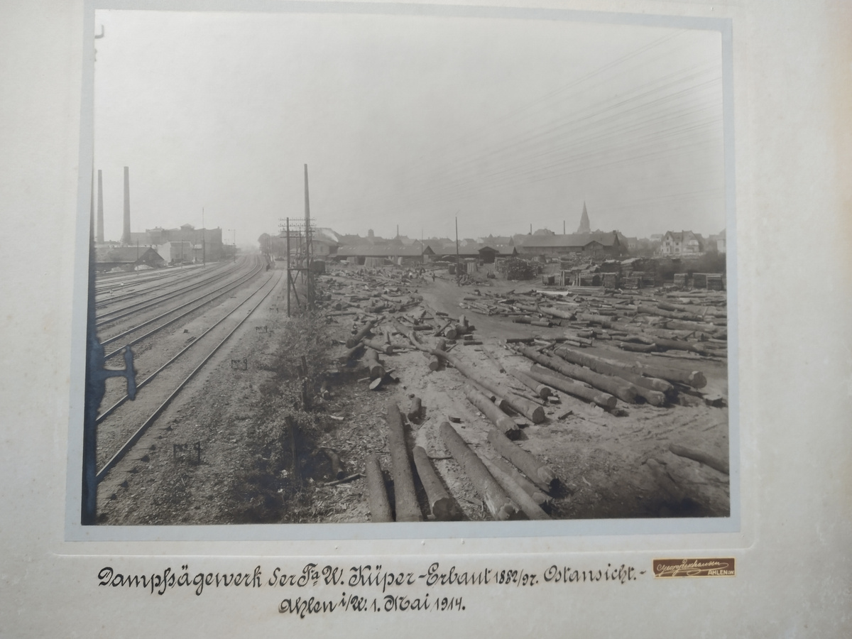 Das Ahlener Sägewerk von Wilhelm Küper stand an der Straße, die bis heute „Holzweg“ heißt – direkt an den Bahngleisen. Mehrere großformatige Fotos aus dem Jahre 1914 dokumentieren den Zustand des Bahnhofsviertels und bieten einen tollen Blick nach Norden auf den Lütkeweg (mit 9 sichtbaren Fabrikschornsteinen!) und nach Süden auf die Kerkmannsche Emaillefabrik.