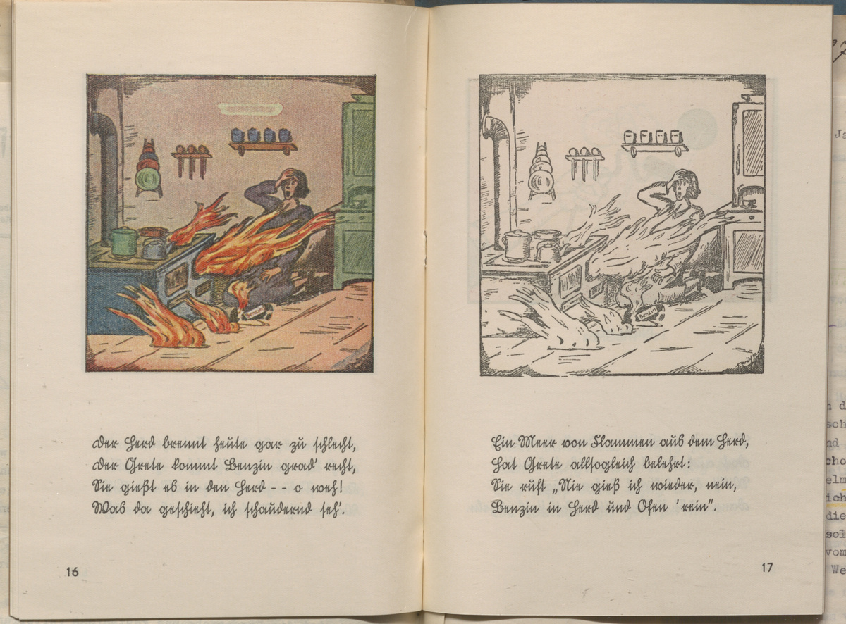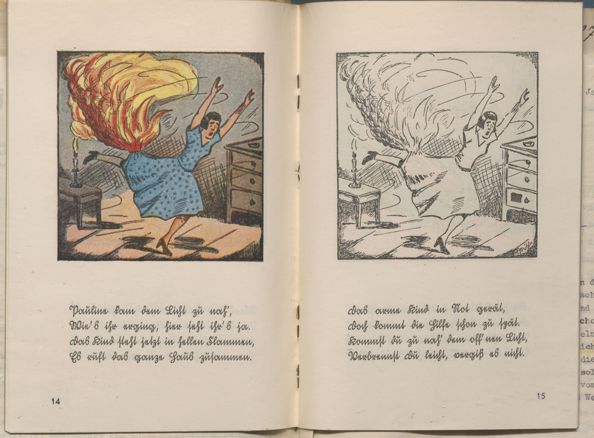 In den überlieferten Verwaltungsunterlagen finden sich hin und wieder auch Kuriositäten. So ist in einer Akte über das Feuerlöschwesen ein Malbuch für Kinder abgeheftet. Mit eindringlichen Bildern sollten diese vor den Gefahren des Feuers gewarnt werden.