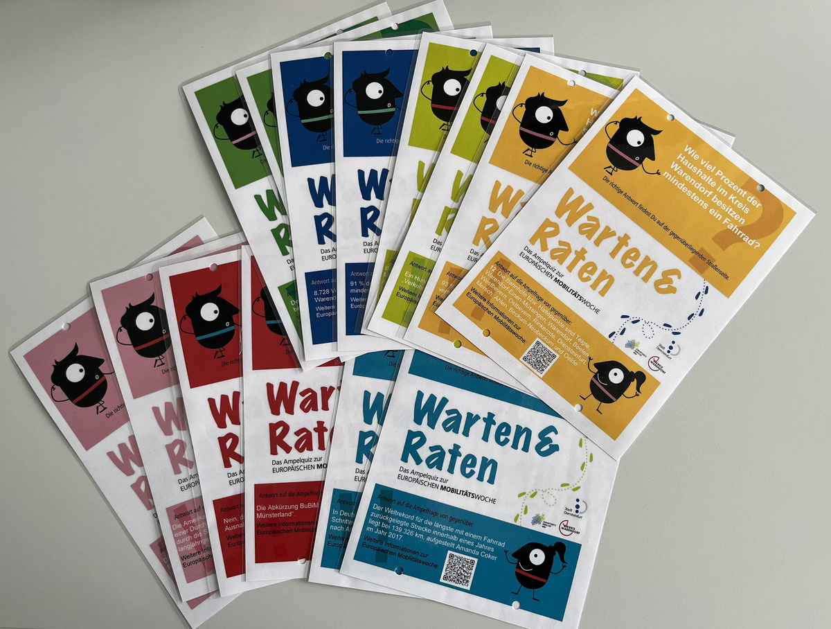 An vielen Fußgängerampeln in Beckum, Drensteinfurt, Oelde, Telgte und Warendorf finden Sie während der Mobilitätswoche Schilder mit spannenden Fragen zum Thema Mobilität. Auf der gegenüberliegenden Straßenseite erwartet Sie dann die Antwort. Jeder kurzer Halt an der Ampel kann somit zu einer kurzen Lernpause werden.