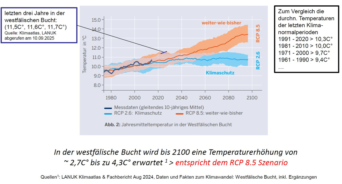 Mit hoher Wahrscheinlichkeit könnte sich die westfälische Bucht zukünftig auf dem "Worst-Case-Szenario" dem RCP 8.5. Pfad bewegen. Dementsprechend sind immense Vorkehrungen hinsichtlich der Klimafolgenanpassung zu treffen. Es wird ein starker Anstieg von Extremwetterereignissen und Klimafolgen (Hitze, Dürre, Starkregen, Hochwasser, Anstieg invasiver Arten) in den nächsten Jahrzehnten erwartet. Dieser Sachverhalt und daraus resultierende Anpassungsmaßnahmen werden insbesondere, im derzeit noch in Arbeit befindlichen, Klimafolgenanpassungskonzept aufgegriffen.