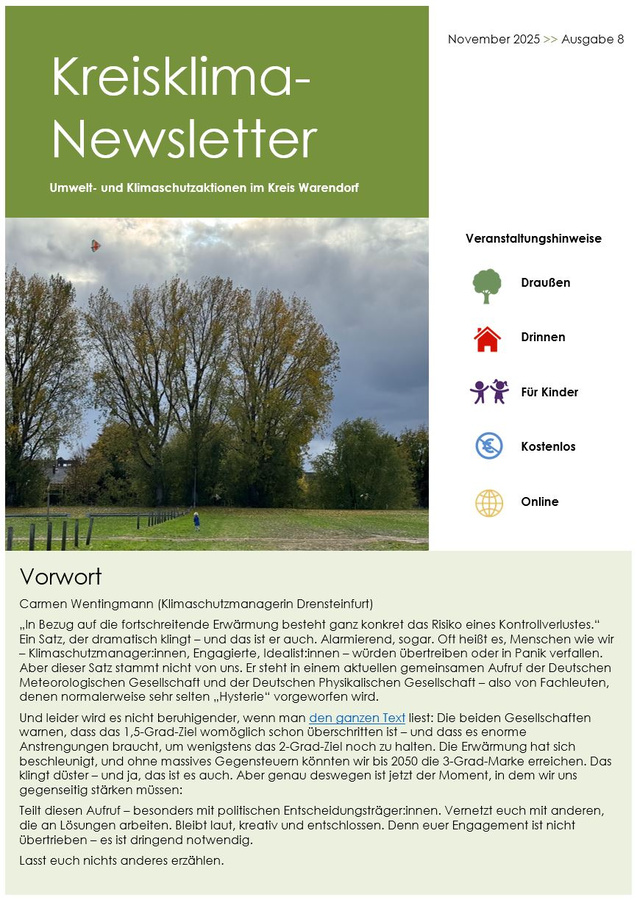 Der Kreis Warendorf übernimmt Verantwortung und hat den politischen Beschluss gefasst, bis 2040 klimaneutral zu werden. Um dieses Ziel zu erreichen, setzt der Kreis Warendorf zahlreiche Maßnahmen selbst um und unterstützt die kreisangehörigen Kommunen, Unternehmen und Bürgerinnen und Bürger auf dem Weg zur Klimaneutralität. Zudem unterstützt der Kreis Warendorf aktiv die regionale Initiative "Münsterland ist Klimaland".